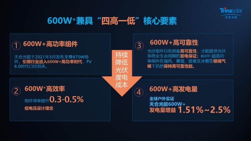 據(jù)天合光能全球產(chǎn)品戰(zhàn)略與市場(chǎng)負(fù)責(zé)人張映斌博士介紹,“四高一低“底層邏輯是從度電成本出發(fā),將落腳點(diǎn)歸于度電成本。目前600W+組件幾乎滿足了“四高一低”所有條件,600W+為度電成本下降打開了嶄新的通道。