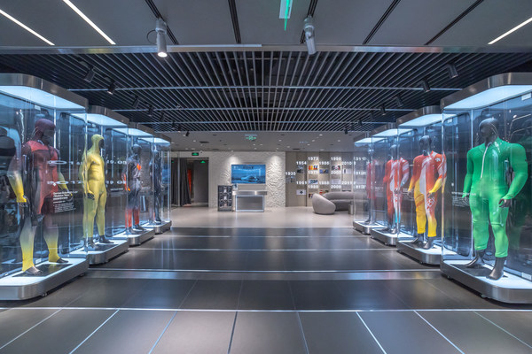 二層的迷你品牌博物館全新升級(jí),如時(shí)空隧道般的空間中,陳列了4件迪桑特贊助的世界領(lǐng)先冰雪國(guó)家隊(duì)比賽服和2件贊助鐵三國(guó)家隊(duì)比賽服,以及品牌歷史上2件劃時(shí)代的比賽服MAGIC SUIT魔法運(yùn)動(dòng)套裝和GOLDEN SUIT黃金戰(zhàn)袍,帶領(lǐng)參觀者回顧迪桑特的歷史與榮耀。在隧道的盡頭是品牌歷史墻,將品牌87年發(fā)展史中的科技里程碑一一呈現(xiàn)。