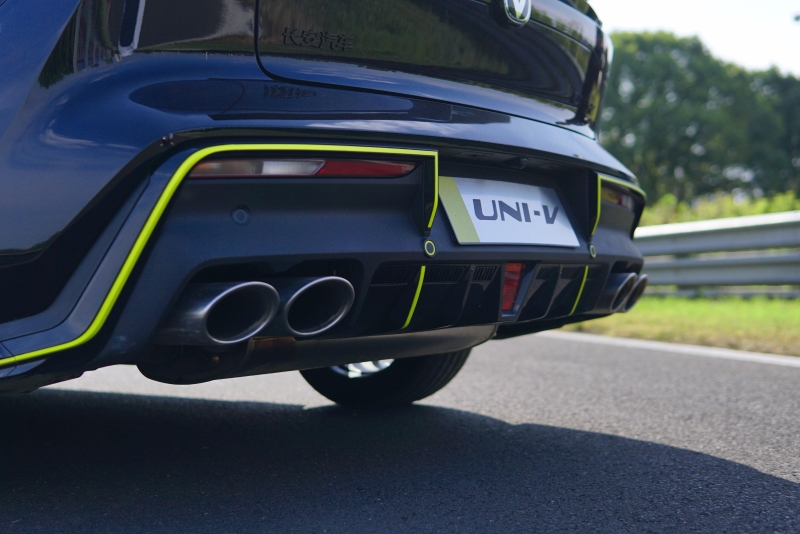 UNI-V是同價(jià)位車型中唯一配備電動(dòng)升降后擾流板的車型,后擾流板能通過按鍵手動(dòng)控制升降,升起時(shí)可以提供25公斤的下壓力。