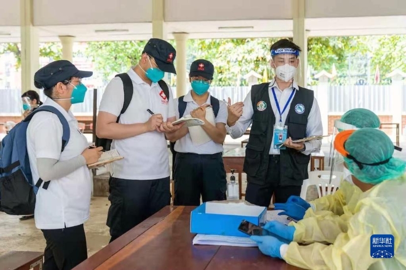 2021年5月7日,中國(guó)政府醫(yī)療專家組在老撾首都萬(wàn)象考察一個(gè)新冠病毒采樣點(diǎn),了解采樣流程、信息采集、密切接觸者判定標(biāo)準(zhǔn)和環(huán)境消毒等情況。新華社發(fā)(中國(guó)政府醫(yī)療專家組供圖)