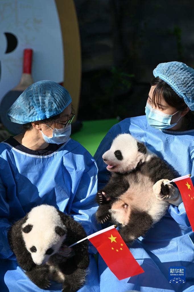 9月28日,成都大熊貓繁育研究基地工作人員抱著2022級(jí)新生大熊貓幼仔亮相太陽(yáng)產(chǎn)房。