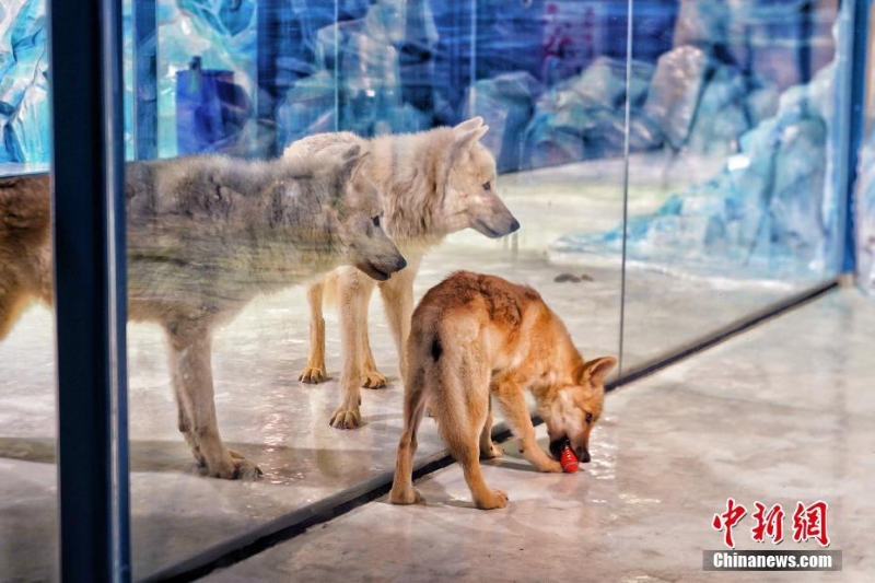 9月28日,世界首只克隆北極狼在哈爾濱極地公園和公眾見(jiàn)面。據(jù)了解,克隆北極狼的供體細(xì)胞來(lái)自北極狼“瑪雅”的皮膚樣本,代孕母體是一只比格犬?,F(xiàn)在,克隆北極狼已順利過(guò)“百天”,各項(xiàng)指標(biāo)顯示均正常。圖為克隆小北極狼“瑪雅”和館內(nèi)另外兩頭北極狼。 中新社記者 孫漢侖 攝