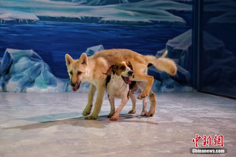 9月28日,世界首只克隆北極狼在哈爾濱極地公園和公眾見(jiàn)面。據(jù)了解,克隆北極狼的供體細(xì)胞來(lái)自北極狼“瑪雅”的皮膚樣本,代孕母體是一只比格犬。現(xiàn)在,克隆北極狼已順利過(guò)“百天”,各項(xiàng)指標(biāo)顯示均正常。圖為克隆小北極狼“瑪雅”和比格犬“媽媽”在一起。 中新社記者 孫漢侖 攝