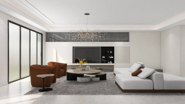 家具選用灰棕撞色沙發(fā)搭配灰黑撞色茶幾,再用棕色沙發(fā)椅做點(diǎn)綴,色彩之間的相互呼應(yīng),增強(qiáng)了空間的整體性和協(xié)調(diào)性。