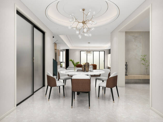 餐廳與客廳相互聯(lián)通,讓動(dòng)線通透無礙,也更顯寬敞。地面鋪貼蒙娜麗莎國風(fēng)·時(shí)光系列荏苒陶瓷大板,清新淡雅的淺灰色,讓人感覺格外溫馨。天花板設(shè)計(jì)成暖白色,并用圓形黑色線條做點(diǎn)綴,簡潔又不失優(yōu)雅。