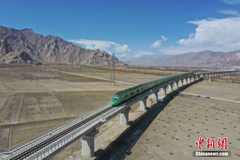 資料圖為2022年3月16日,一列復(fù)興號動車組從拉薩市曲水縣協(xié)榮特大橋上經(jīng)過。復(fù)興號動車組開上青藏高原,突破海拔障礙,實現(xiàn)高原運營。(無人機照片) 中新社記者 貢嘎來松 攝