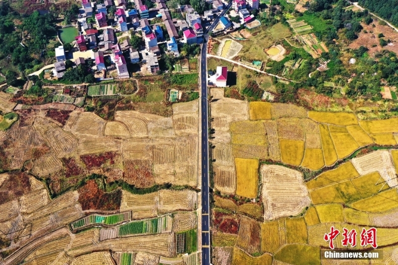 資料圖為2020年11月13日,航拍位于江西省鷹潭市月湖區(qū)的X002縣道(梅里路),農(nóng)村公路穿梭金色稻田和秀美鄉(xiāng)村。(無人機照片) 中新社記者 劉占昆 攝