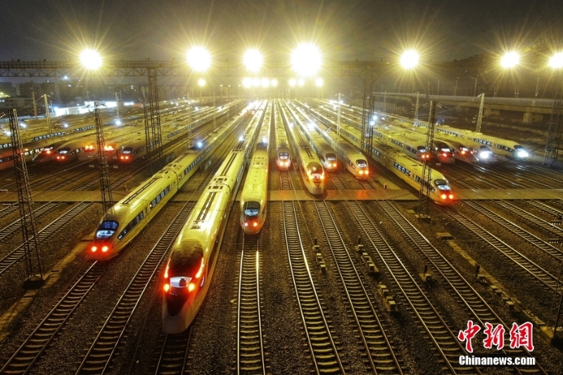 資料圖為2019年1月21日凌晨,??吭谀暇┠蟿榆囁孳嚲€上的列車經(jīng)過檢修后準備出發(fā),為期40天的春運大幕拉開。(無人機照片) 中新社記者 泱波 攝