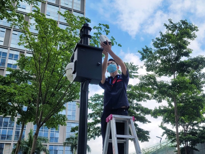 南沙環(huán)球中心工程人員安裝高空拋物監(jiān)控攝像頭