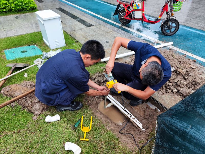 工程部人員在雨中安裝洗手池