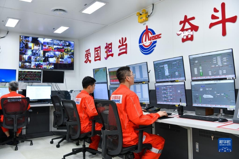中海油工作人員在“?;惶枴笨刂剖依镞M行操作(9月30日攝)。新華社記者 梁旭 攝