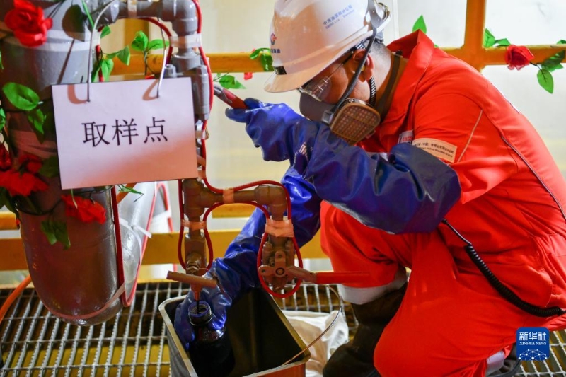 中海油工作人員在“海基一號”取樣點接取原油(9月30日攝)。新華社記者 梁旭 攝
