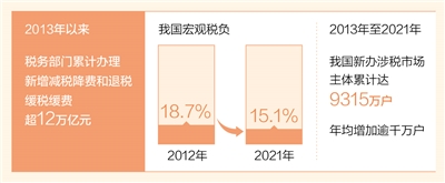 習近平總書記指出:“減稅降費政策措施要落地生根,讓企業(yè)輕裝上陣。”黨的十八大以來,在以習近平同志為核心的黨中央堅強領導下,減稅降費政策從宏觀“降稅負”到微觀“降成本”,不斷加力。數(shù)據(jù)顯示,2013年至2021年,稅務部門累計辦理新增減稅降費8.8萬億元,加上今年落實新的組合式稅費支持政策,截至目前,累計辦理新增減稅降費和退稅緩稅緩費超12萬億元。我國宏觀稅負從2012年的18.7%降至2021年的15.1%。減稅降費政策為廣大市場主體減負擔、添活力,有力推動了經(jīng)濟高質(zhì)量發(fā)展。