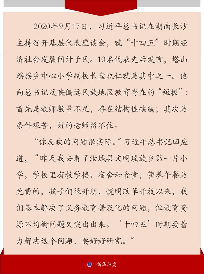 2020年9月17日,習(xí)近平總書記在湖南長沙主持召開基層代表座談會(huì),就“十四五”時(shí)期經(jīng)濟(jì)社會(huì)發(fā)展問計(jì)于民。10名代表先后發(fā)言,塔山瑤族鄉(xiāng)中心小學(xué)副校長盤玖仁就是其中之一。他向總書記反映偏遠(yuǎn)民族地區(qū)教育存在的“短板”:首先是教師數(shù)量不足,存在結(jié)構(gòu)性缺編;其次是條件艱苦,好的老師留不住。