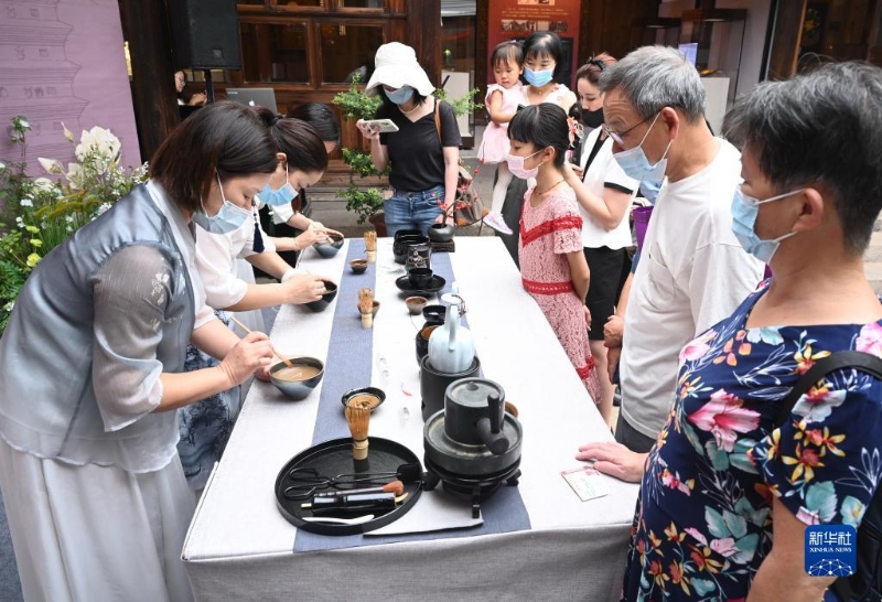 10月7日,游客在福建省非物質(zhì)文化遺產(chǎn)博覽苑觀看宋代點茶和茶百戲表演。