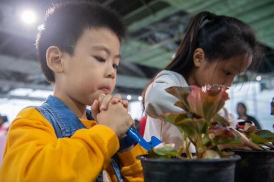 10月5日,在重慶市大足區(qū)雍溪鎮(zhèn)慈云村的天華百卉園內(nèi),小朋友在學(xué)習(xí)種植技巧。新華社記者 唐奕 攝