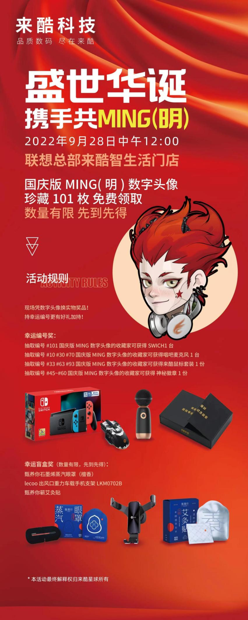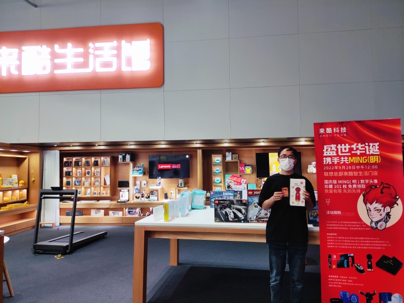 9月28日,來酷科技于聯(lián)想總部來酷智生活門店,舉辦主題為:“盛世華誕,攜手共MING(明)”為祖國送祝福的活動?;顒蝇F(xiàn)場可領(lǐng)取珍藏版101枚國慶版MING(明)數(shù)字頭像,根據(jù)每枚數(shù)字頭像編號的不同,現(xiàn)場更設(shè)置了根據(jù)收藏家國慶版MING(明)數(shù)字頭像編號,抽取神秘大獎,更有幸運盲盒等。本次國慶版MING(明)頭像,基于MING CLUB數(shù)字版權(quán)頭像編號#616進行二次創(chuàng)作,把十一和煙花等國慶的元素與MING(明)頭像相結(jié)合,表達了來酷星球社區(qū)對祖國生日的美好祝愿。現(xiàn)場用戶粉絲反響熱烈,更是體驗到了打開元宇宙大門,體驗數(shù)字藏品所帶來的魅力。