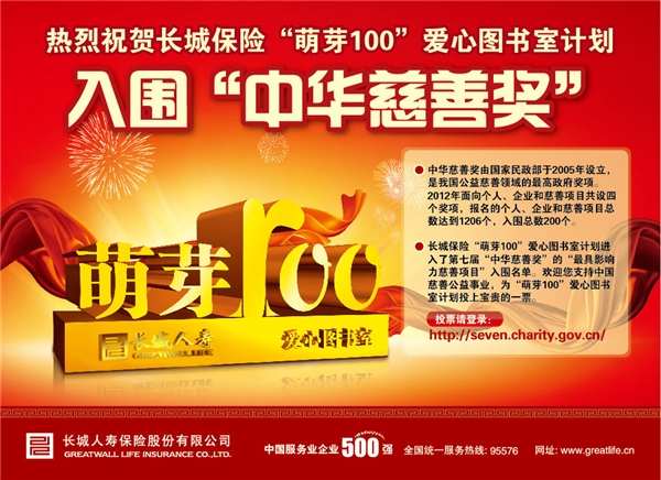 作為保險業(yè)公益事業(yè)的踐行者。自2005年成立以來,長城人壽始終積極履行社會責(zé)任,參與捐資助學(xué)、減災(zāi)扶弱等公益活動,讓愛根植于每個長城人心中。2009年,長城人壽傾力打造“萌芽100”愛心圖書室公益項目,致力于為農(nóng)村貧困地區(qū)及城鎮(zhèn)農(nóng)民工子弟小學(xué)捐建可持久使用的愛心圖書室,希望“以百分百的真誠和奉獻(xiàn),為孩子們提供百分百的溫暖與關(guān)愛”。從創(chuàng)立至今持續(xù)十三年,累計在全國捐建愛心圖書室143 座,遍及12個省市,累計捐贈圖書40萬冊,受益學(xué)生逾45萬人。該公益項目曾兩次入圍中國政府慈善最高獎——“中華慈善獎”,連續(xù)七次蟬聯(lián)中國公益節(jié)大獎。