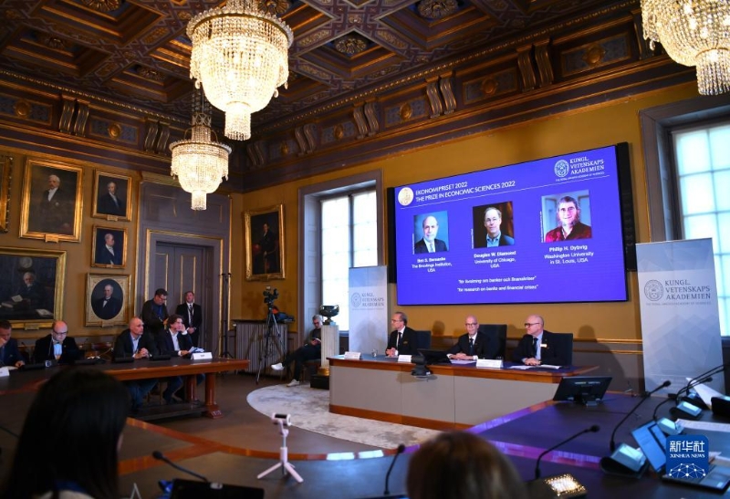 這是10月10日在瑞典斯德哥爾摩拍攝的2022年諾貝爾經(jīng)濟學(xué)獎公布現(xiàn)場。新華社記者 任鵬飛 攝