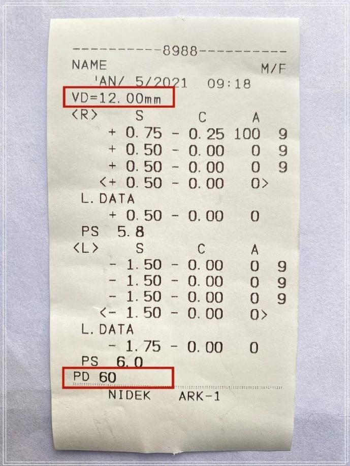 VD是指鏡眼距(表示測(cè)試距離),這個(gè)距離就跟我們平時(shí)戴眼鏡時(shí)從鏡片到角膜頂點(diǎn)的距離差不多。PD是指瞳距,表示兩眼間瞳孔中心(黑眼仁中心)的距離。