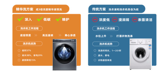 時下主流的滾筒洗衣機(jī)產(chǎn)品,存在著洗滌時間長,磨損率高,同時因為洗滌劑溶解慢、容易導(dǎo)致污漬清理不徹底。精華洗技術(shù)顛覆了傳統(tǒng)的洗滌方式,通過創(chuàng)新速溶預(yù)混,生成3倍濃度的精華液,高壓直噴迅速滲透衣物纖維,有效剝離污漬。傳統(tǒng)滾筒洗衣機(jī)需要1—2個小時才能達(dá)到的洗凈效果,精華洗洗衣機(jī)39分鐘就可實(shí)現(xiàn),同時能將衣服磨損降低15%,用水量和耗電量分別節(jié)省38%和29%。