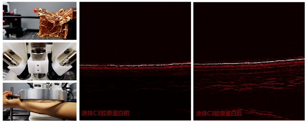 值得一提的是,本次全球首個重組膠原蛋白人體活體皮膚滲透性實驗,摒棄了傳統(tǒng)豬皮牛皮的動物實驗,通過光聲/熒光共聚焦顯微成像技術(shù)實現(xiàn)無創(chuàng)、可視化真皮層滲透的全過程,是區(qū)別于傳統(tǒng)動物實驗、細胞實驗、3D皮膚實驗以外,更具有國際領(lǐng)先意義的科學(xué)重大發(fā)明。