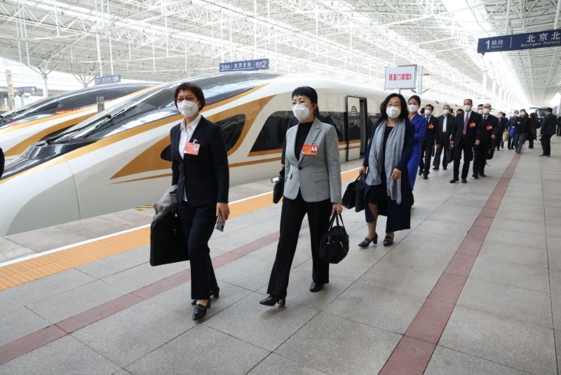10月13日,來自內(nèi)蒙古自治區(qū)的黨的二十大代表乘高鐵抵達(dá)北京北站。這是當(dāng)日首個(gè)抵京的京外代表團(tuán)。新華社記者 張玉薇 攝