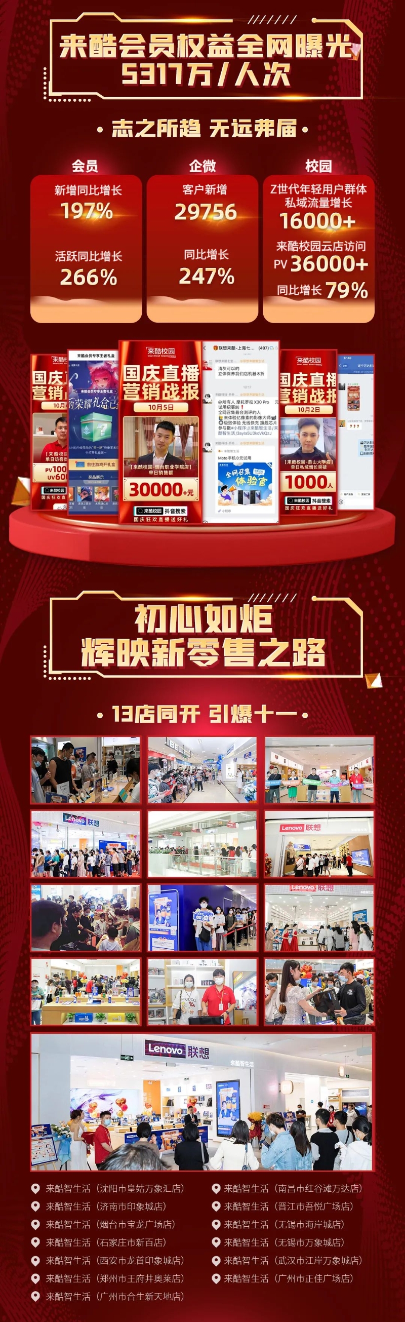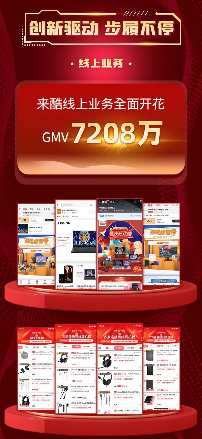 近年來(lái),來(lái)酷作為新零售領(lǐng)域的獨(dú)角獸企業(yè),以獨(dú)有的OMO全域智慧零售模式,將種類豐富的優(yōu)質(zhì)產(chǎn)品通過(guò)各種渠道展現(xiàn)在消費(fèi)者面前,全時(shí)全域滿足用戶需求!新零售業(yè)態(tài)下的來(lái)酷融合精準(zhǔn)營(yíng)銷,不斷完善生態(tài)合作矩陣。剛剛過(guò)去的“十一”黃金周,來(lái)酷銷售成績(jī)?cè)賱?chuàng)新高,線上流量實(shí)現(xiàn)全域高速增長(zhǎng),再次交出高分答卷。截止2022年10月7日,來(lái)酷2022年 “十一”銷售業(yè)績(jī)戰(zhàn)報(bào)重磅出爐。10月1日至10月7日期間,整體銷售1.4650億元、來(lái)酷小時(shí)達(dá)本地生活即時(shí)零售,聯(lián)通全國(guó)258家門(mén)店,銷售額1148萬(wàn),小時(shí)達(dá)訂單同比增長(zhǎng)27.87%、Think工作站首登來(lái)酷銷售榜單、線上業(yè)務(wù)全面開(kāi)花,GMV7208萬(wàn)、會(huì)員權(quán)益全網(wǎng)曝光5317萬(wàn)人次、多平臺(tái)直播,GMV247149.6元,PV15768次、銷服一體共服務(wù)客戶2520人,總收入102萬(wàn)、品牌獲數(shù)百萬(wàn)曝光,粉絲新增同比達(dá)1885.15%,粉絲活躍互動(dòng)環(huán)比達(dá)380.77%。令人驚艷倍增數(shù)據(jù),真正體現(xiàn)出來(lái)酷作為智慧零售先鋒的實(shí)力與底蘊(yùn)。