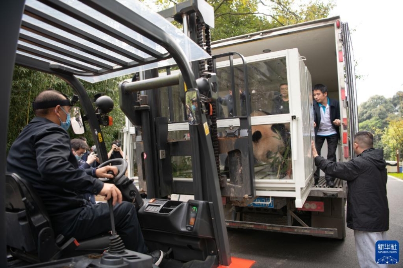 10月18日,在中國大熊貓保護(hù)研究中心雅安基地,工作人員將大熊貓“京京”轉(zhuǎn)移至車上。