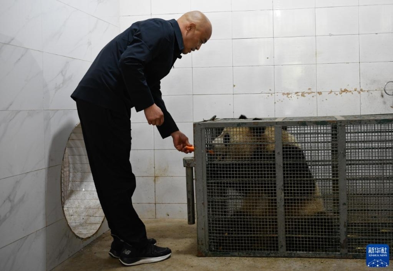 10月18日,在中國大熊貓保護(hù)研究中心雅安基地,飼養(yǎng)師董禮用胡蘿卜安撫進(jìn)入轉(zhuǎn)運(yùn)籠的大熊貓“四海”。