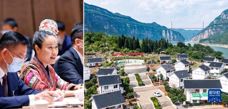 拼版照片:左圖為黨的二十大代表許蕾在貴州代表團(tuán)討論中發(fā)言(新華社記者劉衛(wèi)兵10月17日攝);右圖為貴州省黔西市新仁苗族鄉(xiāng)化屋村麻窩寨易地扶貧搬遷集中安置點(diǎn)(新華社記者陶亮5月6日攝)。
