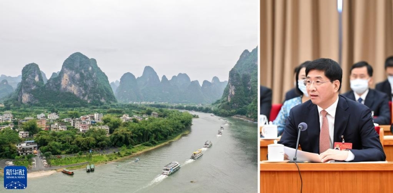 拼版照片:右圖為黨的二十大代表周家斌在廣西代表團(tuán)討論中發(fā)言(新華社記者謝環(huán)馳2022年10月17日攝);左圖為漓江廣西陽朔段(新華社記者曹祎銘2021年4月25日攝)。