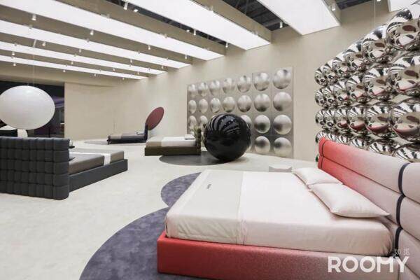 走進「ROOMY如覓」位于北京的品牌專營店,看不到被塞得滿滿的家具和沒有表情的樣板間,反而像是走進了一所畫廊,懸浮的球形裝置、低明度偏灰的色彩,營造出一個獨特夢幻的空間,一張張以前在臥室甘當(dāng)配角的床具,在這里,成為視覺的中心。