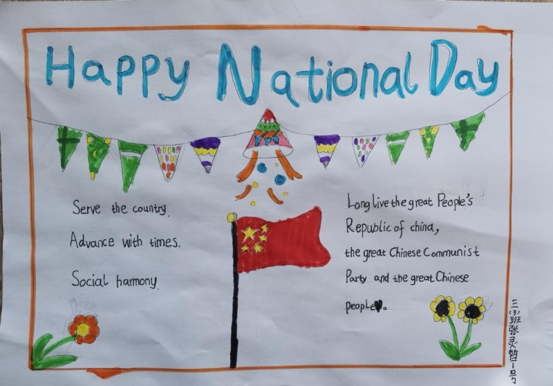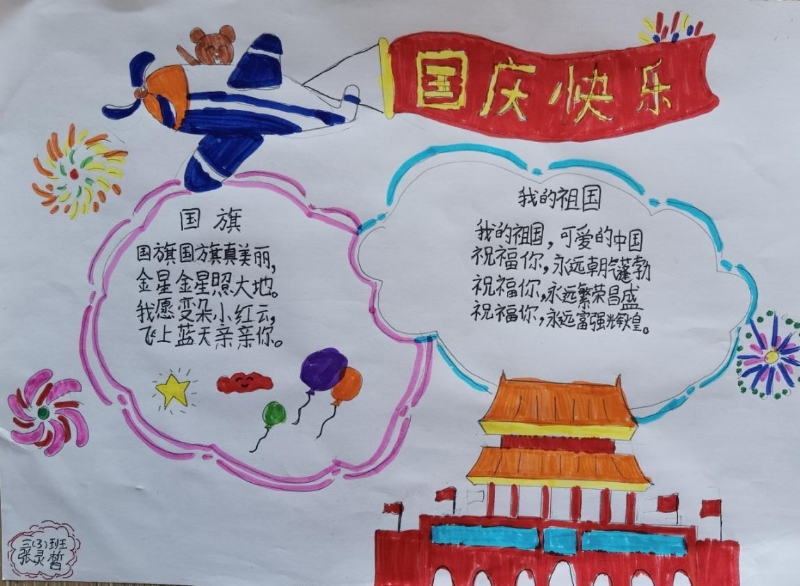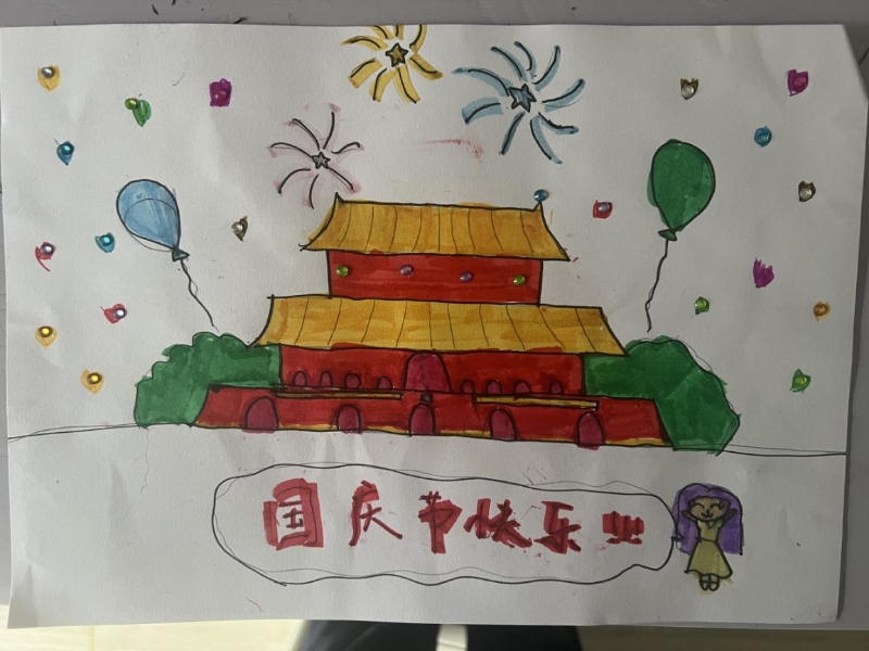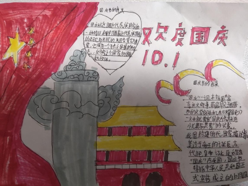 此活動得到了大家的積極響應(yīng),積極參加活動的孩子們在假期之間踴躍“潑墨”,認(rèn)真繪畫,完成了高質(zhì)量的手抄報。10月8日,孩子們的手抄報交上來后,映入眼簾的作品給人驚喜,大家的作品童趣橫生,采用圖片、文字結(jié)合的方式,有的手抄報上繪畫了天安門城樓,有的是中英文結(jié)合的方式,有的是紅星紅旗與華表結(jié)合,均充分表達(dá)了個人喜迎國慶節(jié)的激動之情,能明顯感覺到大家油然而生的作為中國人的自豪感。