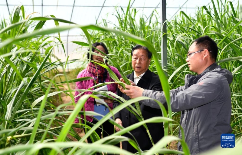 菌草專家林占熺(中)在寧夏銀川市永寧縣閩寧鎮(zhèn)農(nóng)戶劉昌富的大棚里查看菌草生長情況(2021年3月29日攝)。新華社記者 王鵬 攝