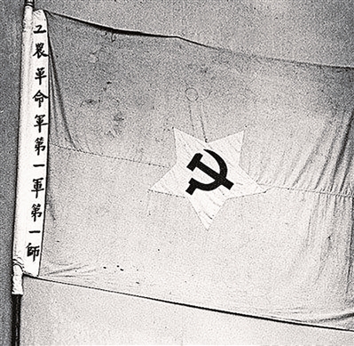 1927年9月至10月底,廣東海陸豐等地農(nóng)民在彭湃等共產(chǎn)黨員領(lǐng)導(dǎo)下,在海豐、陸豐及附近地區(qū)舉行武裝起義,參加起義的海豐縣赤衛(wèi)軍打出了自己的軍旗。同月,經(jīng)過周密商議后,中共中央決定以中國(guó)共產(chǎn)黨的名義發(fā)動(dòng)秋收起義,不再打國(guó)民黨的旗幟,而是由剛成立的工農(nóng)革命軍第一軍第一師設(shè)計(jì)制作軍旗。因沒有現(xiàn)成樣板,經(jīng)過反復(fù)研究,設(shè)計(jì)出帶有鐮刀、斧頭、五角星的紅色軍旗。旗幟的紅底象征革命;旗中央為白色五角星,代表中國(guó)共產(chǎn)黨;五角星內(nèi)有黑色鐮刀、斧頭,分別代表農(nóng)民和工人;旗面靠旗褲一側(cè)縫有一條白布,上面用黑布縫寫著繁體的“工農(nóng)革命軍第一軍第一師”字樣。全旗的含義為工農(nóng)革命軍是中國(guó)共產(chǎn)黨領(lǐng)導(dǎo)下的工農(nóng)革命武裝。我軍歷史上第一面軍旗就此誕生。