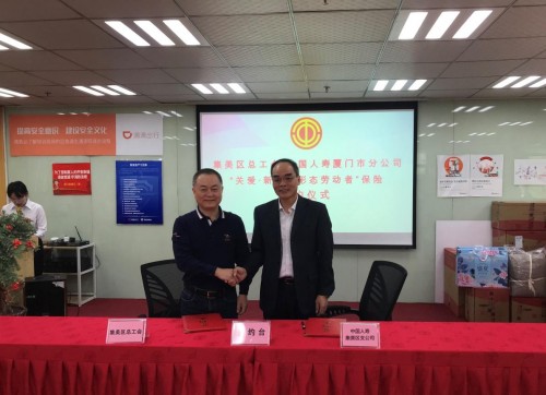 近年來,新業(yè)態(tài)靈活就業(yè)人群快速增長,對風(fēng)險保障的需求越發(fā)強(qiáng)烈,維護(hù)新業(yè)態(tài)勞動者權(quán)益,建立并完善新業(yè)態(tài)人員保障體系建設(shè)是近年國家“穩(wěn)民生保就業(yè)”的關(guān)注焦點(diǎn)。10月19日上午,中國人壽保險股份有限公司廈門市集美區(qū)支公司攜手集美區(qū)總工會舉行了“關(guān)愛·新就業(yè)形態(tài)勞動者”保險簽約儀式,集美區(qū)總工會常務(wù)副主席黃國棟、二級調(diào)研員吳伯榮、廈門國壽副總經(jīng)理郭溪順,廈門國壽團(tuán)體業(yè)務(wù)部總經(jīng)理王偉權(quán)以及集美區(qū)支公司經(jīng)理方長根、副經(jīng)理陳勇文等出席簽約儀式。