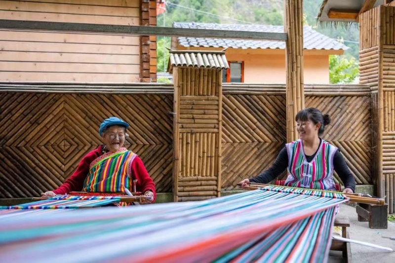△云南怒江貢山縣獨龍江鄉(xiāng)獨龍族老人李文仕(左)和女兒在編織獨龍?zhí)骸?/p>