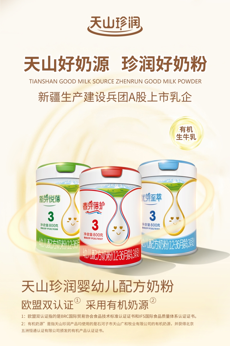 “天山牧場(chǎng)有機(jī)奶源年產(chǎn)僅9000噸,是最適合做嬰幼兒奶粉的有機(jī)奶源之一,這也是天山云牧決定要做奶粉的原因?!卞X(qián)星辰介紹,天山珍潤(rùn)是新疆天山云牧乳業(yè)全力打造的有機(jī)奶粉品牌。天山云牧目前擁有23個(gè)現(xiàn)代化牧場(chǎng)、2個(gè)有機(jī)牧場(chǎng),產(chǎn)品矩陣覆蓋液奶、酸奶、調(diào)制乳粉、嬰配粉等50余項(xiàng)主營(yíng)產(chǎn)品,是新疆生產(chǎn)建設(shè)兵團(tuán)最大的牛羊養(yǎng)殖基地和乳品生產(chǎn)基地。