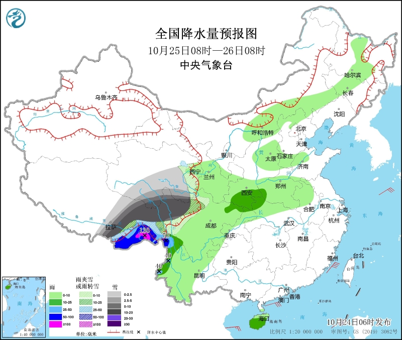 10月25日08時至26日08時,西藏東部和南部、青海南部、川西高原等地部分地區(qū)有中雪,其中,西藏東北部和南部、青海南部、川西高原北部等地部分地區(qū)有大雪到暴雪。西藏南部和東部、陜西南部、四川東北部和西南部、云南西北部、海南島等地部分地區(qū)有中到大雨,其中,西藏東南部等地部分地區(qū)有暴雨或大暴雨(100~130毫米)(見圖2)。臺灣海峽、臺灣以東洋面、巴士海峽、南海北部和中東部海域?qū)⒂?~8級、陣風9級的偏東到東北風。