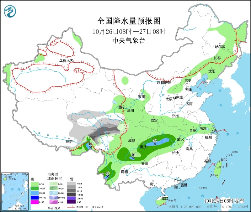 10月26日08時至27日08時,西藏北部和東部、西北地區(qū)中部、西南地區(qū)北部等地部分地區(qū)有小到中雪,其中,西藏東北部、川西高原北部等地部分地區(qū)有大到暴雪。西藏東部、重慶、湖北西南部、貴州北部、四川盆地南部、云南西南部、海南島、臺灣島等地部分地區(qū)有中雨,其中,西藏東南部、湖北南部、湖南北部和西部、重慶東南部和中部、貴州西北部、云南西南部等地部分地區(qū)有大雨(25~40毫米)。黑龍江東北部部分地區(qū)有4~5級風(見圖3)。