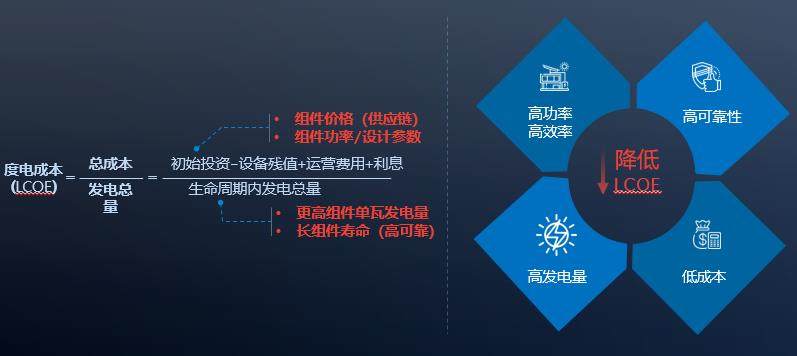 另一方面看分母,增加電站生命周期內發(fā)電總量也是降低光伏發(fā)電度電成本的關鍵。第一單瓦發(fā)電能力,第二是產品可持續(xù)、高可靠,長久發(fā)電。高發(fā)電量、高可靠性組件產品直接增加電站項目全生命周期的發(fā)電總量,使分母變大。分子越小,分母越大,比值度電成本就可持續(xù)降低。