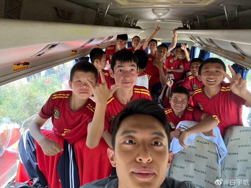 此外,演員白宇帆還在社交媒體個(gè)人賬號(hào)發(fā)布了一張照片,分享了拍攝期間感悟,這是蘇州金龍海格瑞龍中巴車?yán)锼c“足球小將”們的自拍照。