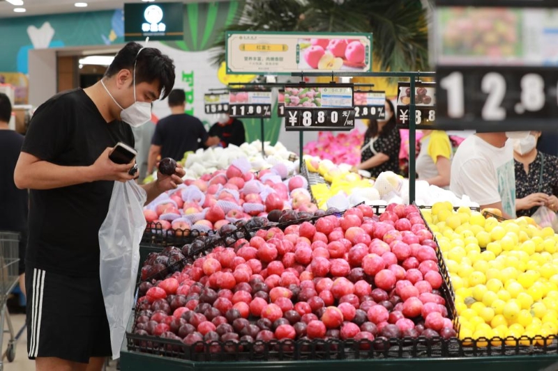 8月1日,在蘭州市城關(guān)區(qū)北京華聯(lián)超市東方紅廣場店,市民在選購水果。(新華社記者杜哲宇攝)