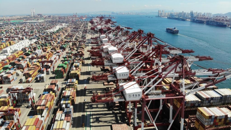 9月10日,貨輪在山東港口青島港裝卸集裝箱。(新華社記者李紫恒攝)