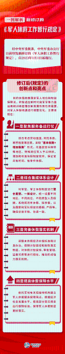 記者:據(jù)報道,軍委辦公廳近日印發(fā)新修訂的《軍人休假工作暫行規(guī)定》。請問修訂這部法規(guī)有什么重要意義?修訂后的法規(guī)有哪些創(chuàng)新點和亮點?