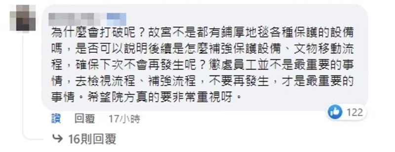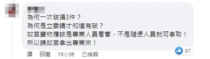 有網(wǎng)友表示:“怎么一到你們手中就連破3個,你們對得起用生命護(hù)送的前輩嗎?”“為什么會打破呢?故宮不是都有鋪厚地毯各種保護(hù)的設(shè)備嗎,是否可以說明后續(xù)是怎么補(bǔ)強(qiáng)保護(hù)設(shè)備、文物移動流程,確保下次不會再發(fā)生呢?”“為何一次破損3件?為何是‘立委’講才知道有破?”。