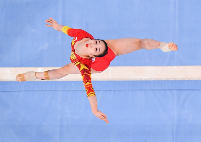 中國選手章瑾在東京奧運(yùn)會(huì)女子團(tuán)體平衡木項(xiàng)目比賽中