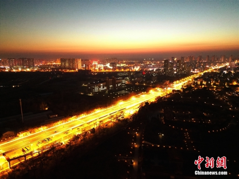 10月30日,齊齊哈爾市民航橋正式建成通車,該橋也是中國(guó)高寒地區(qū)目前已建成的跨度最大、噸位最重連續(xù)梁橋。圖為10月29日,通車前夜拍攝的齊齊哈爾市民航橋。(無(wú)人機(jī)照片) 中新社發(fā) 周博 攝