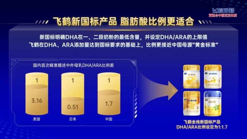 新國標(biāo)對 DHA、ARA 等核心成分也作出了更細(xì)致的規(guī)定。飛鶴科研團(tuán)隊(duì)經(jīng)過系統(tǒng)綜述研究發(fā)現(xiàn),不同于美國和日本,中國母乳中的 DHA、ARA 比例為 1:1.7。因此,飛鶴將星飛帆 900g 在內(nèi)的全線新國標(biāo)產(chǎn)品中的 DHA/ARA 配比調(diào)整為 1:1.7,如此更貼近中國母源 " 黃金標(biāo)準(zhǔn) "。